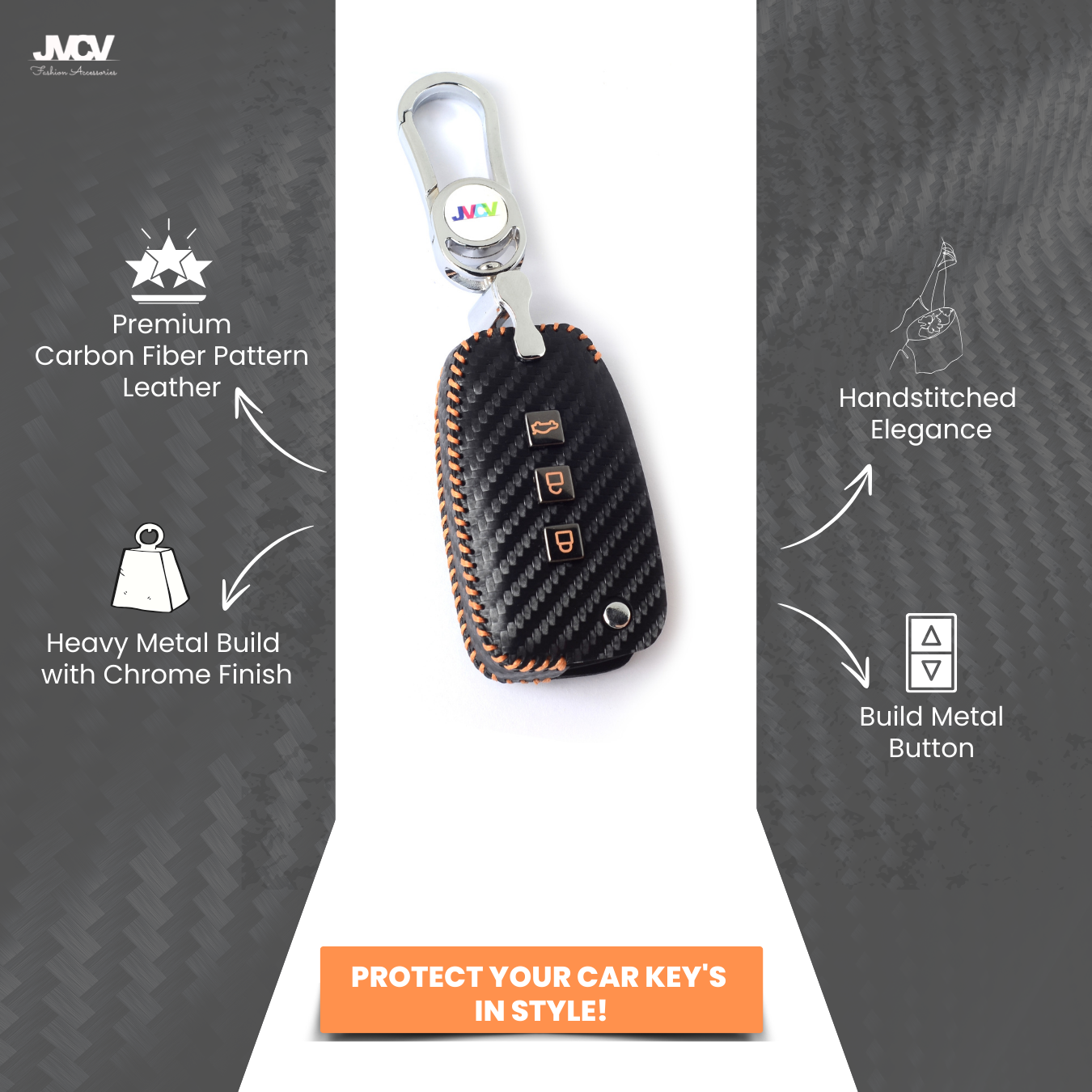 Carbon Fiber Leather Car Key Cover for Hyundai i20, Kona, Verna 3 Button Flip Key - Premium PU Case with Keychain