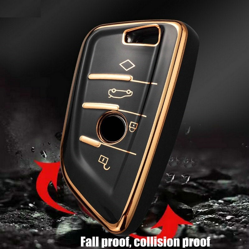 JVCV® Gold Border TPU Key Cover Compatible with BMW X1 X3 X5 X6 5 Series 6 Series 7 Series 3/4 Button Blade Smart Key – Glossy Protective Key Case